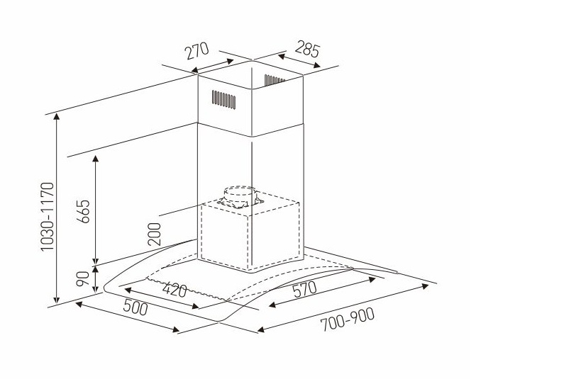 Bản vẽ kích thước Máy hút mùi ARBER AB TM06 ABTM06 70cm kính cong