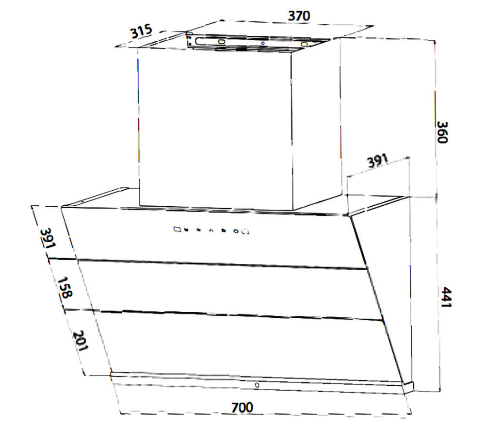 Bản vẽ kích thước Máy hút mùi BLUEGER B-V70SMART 70cm kính vát