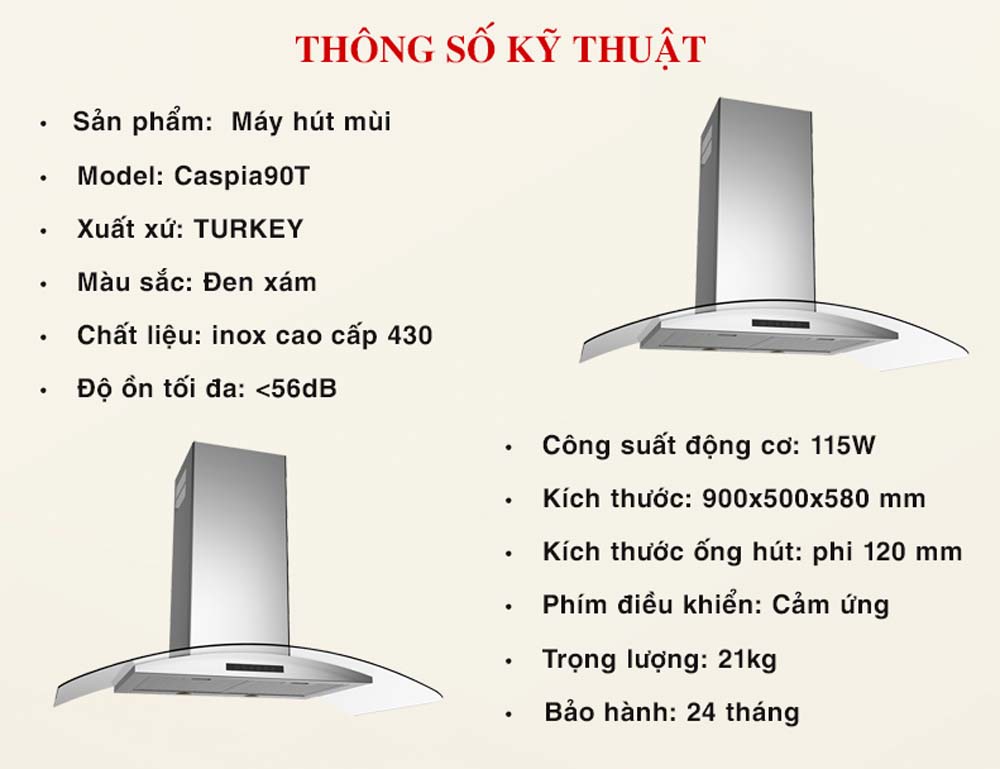 Thông số kĩ thuật Máy hút mùi CHEFS EH-CASPIA90T 90cm kính cong