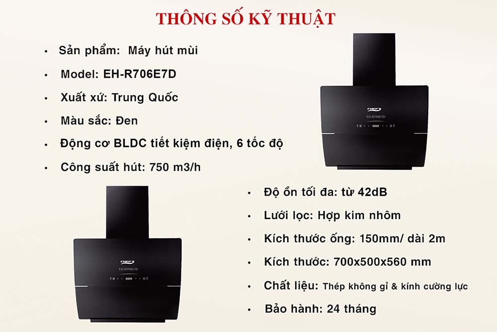 Thông số kĩ thuật Máy hút mùi CHEFS EH-R706E7D 70cm kính vát