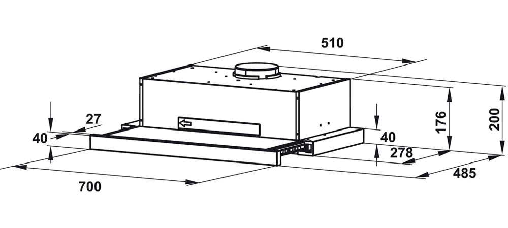 - Kích thước hút: 700X278-485x200mm