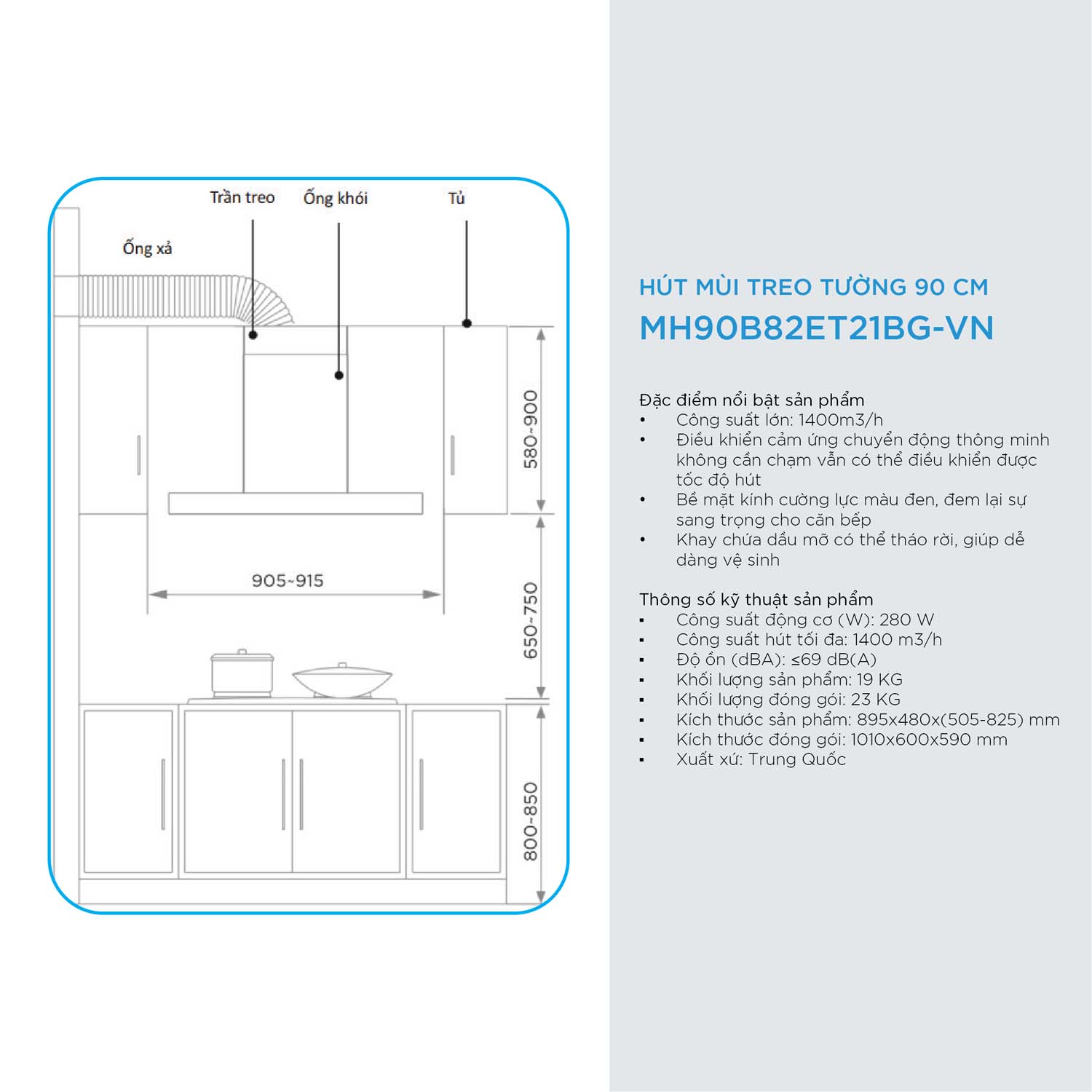 Thông số kĩ thuật Máy hút mùi MIDEA MH90B82ET21BG-VN 90cm chữ T