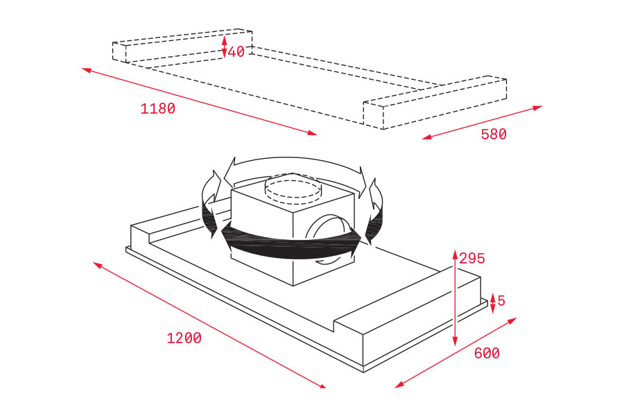- Kích thước hút: 1200x600x290mm