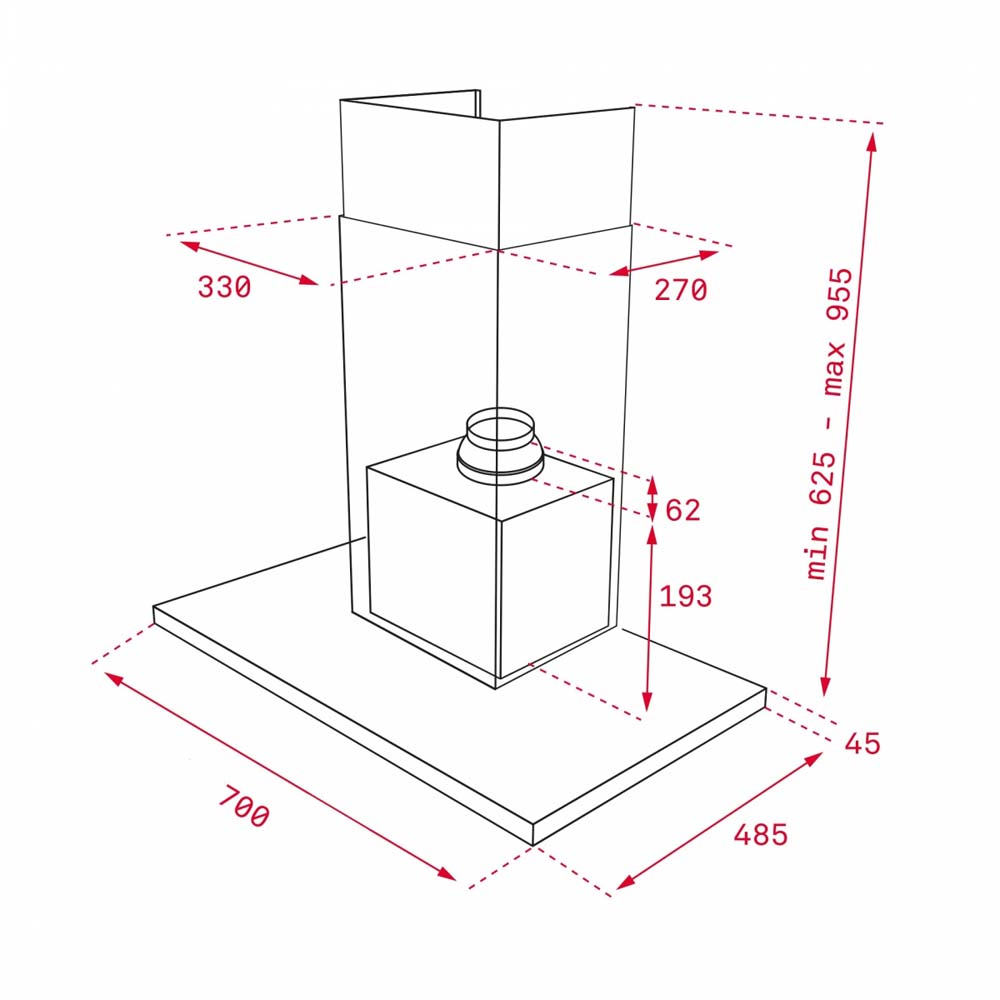 - Kích thước hút: 700x485x625-955mm