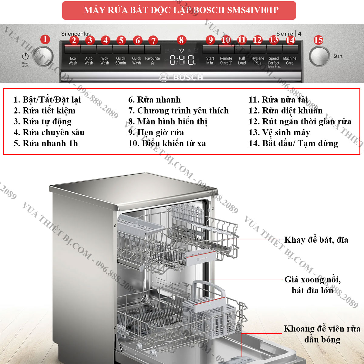 Thông Số Kỹ Thuật Máy rửa bát BOSCH SMS4IVI01P serie 4 độc lập
