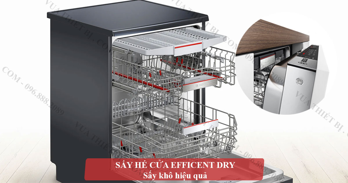 - Tự động hé cửa (EfficientDry): Sau khi hoàn tất chu trình rửa, cửa máy sẽ tự động hé mở để hơi nước thoát ra ngoài, giúp sấy khô bát đĩa tự nhiên, tiết kiệm năng lượng và tránh hơi nước tích tụ.