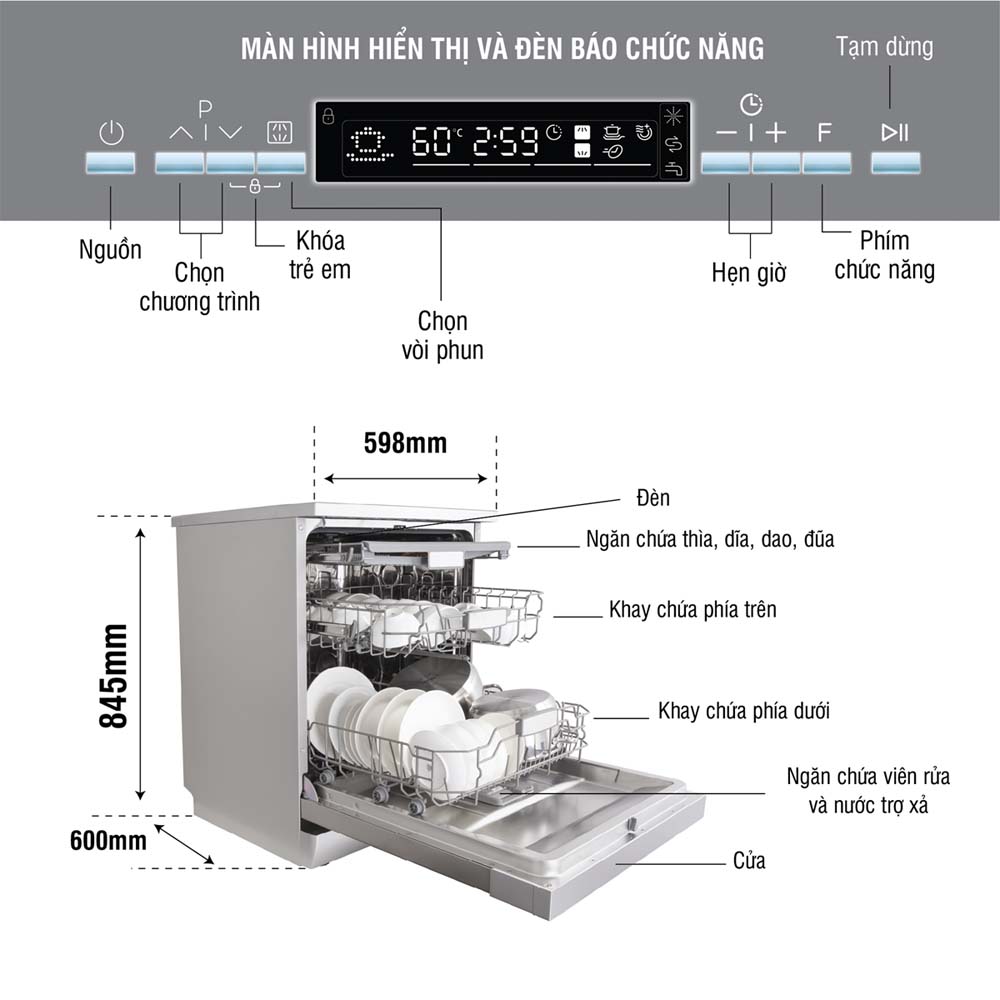 - Kích thước sản phẩm là 598 x 600 x 845 mm, phù hợp để lắp đặt ở vị trí độc lập hoặc âm tủ.