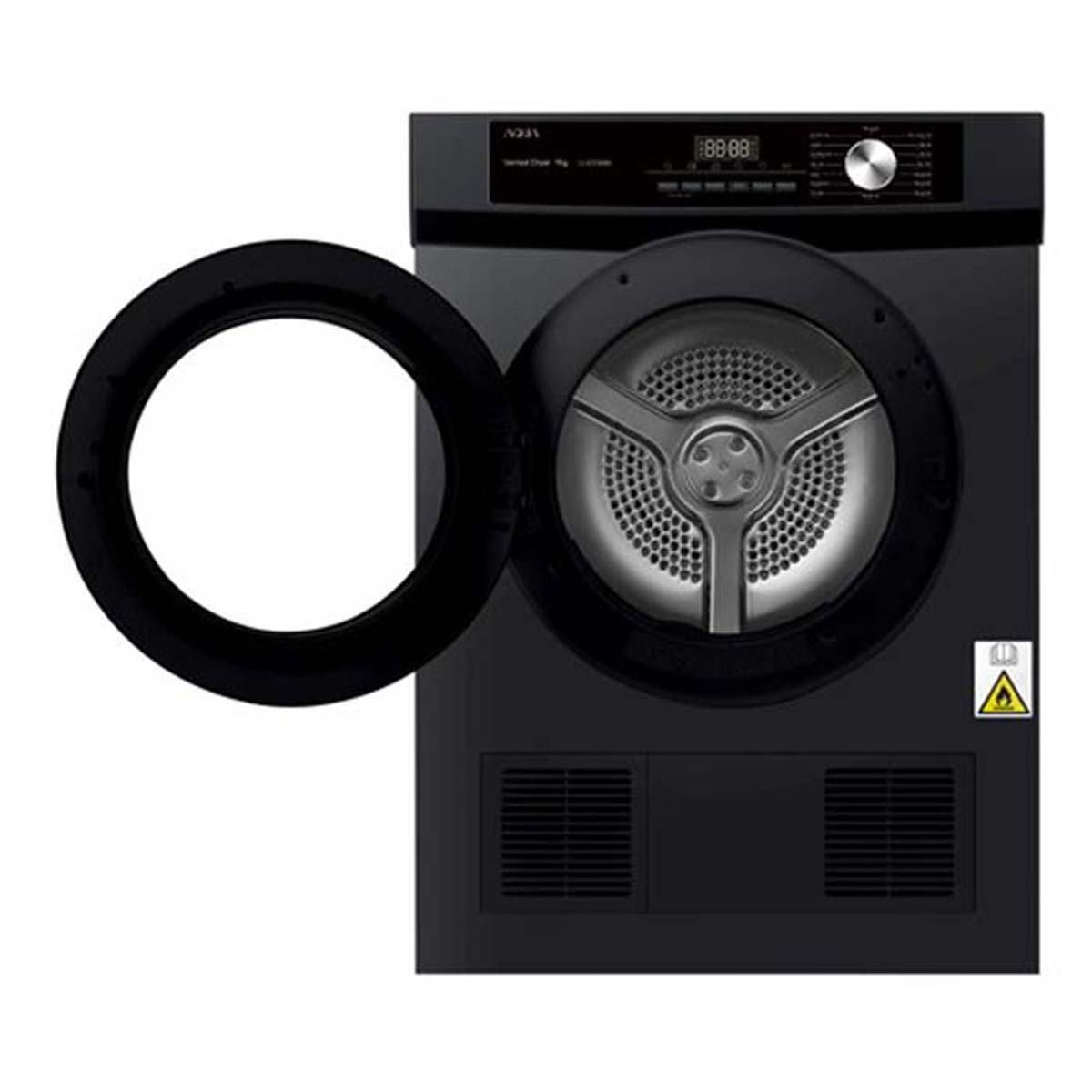 Máy sấy Aqua AQH-V901K.PS sở hữu thiết kế hiện đại với gam màu đen sang trọng, phù hợp với nhiều không gian nội thất. Kích thước nhỏ gọn (Cao 83 cm x Rộng 60 cm x Sâu 56.5 cm) cùng trọng lượng 30 kg giúp dễ dàng lắp đặt, kể cả trong không gian hạn chế như ban công hoặc phòng giặt nhỏ. Bảng điều khiển song ngữ Anh–Việt với núm xoay, nút nhấn và màn hình LED hiển thị rõ ràng, giúp người dùng dễ dàng thao tác và theo dõi quá trình sấy.