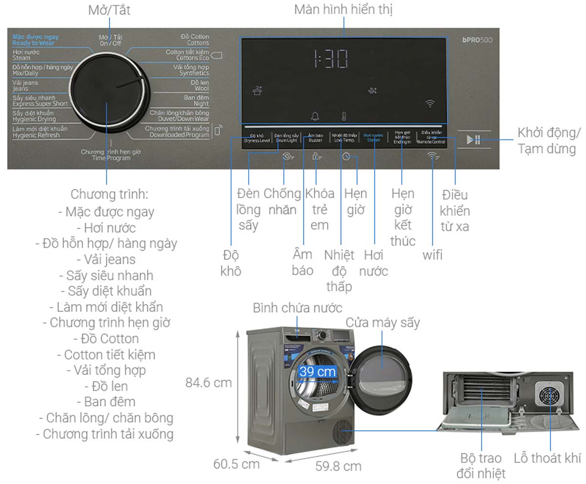 | Bảng điều khiển | Cảm ứng, núm xoay, có màn hình hiển thị |