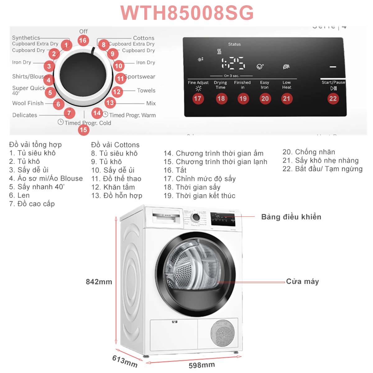 Bosch trang bị cho WTH85008SG màn hình LED hiển thị thông tin rõ ràng, cùng với núm vặn cơ học dễ thao tác. Người dùng có thể tùy chỉnh chương trình phù hợp nhanh chóng, kiểm soát thời gian và trạng thái hoạt động thuận tiện. Thiết kế thân thiện này giúp mọi thành viên trong gia đình đều có thể sử dụng dễ dàng.
