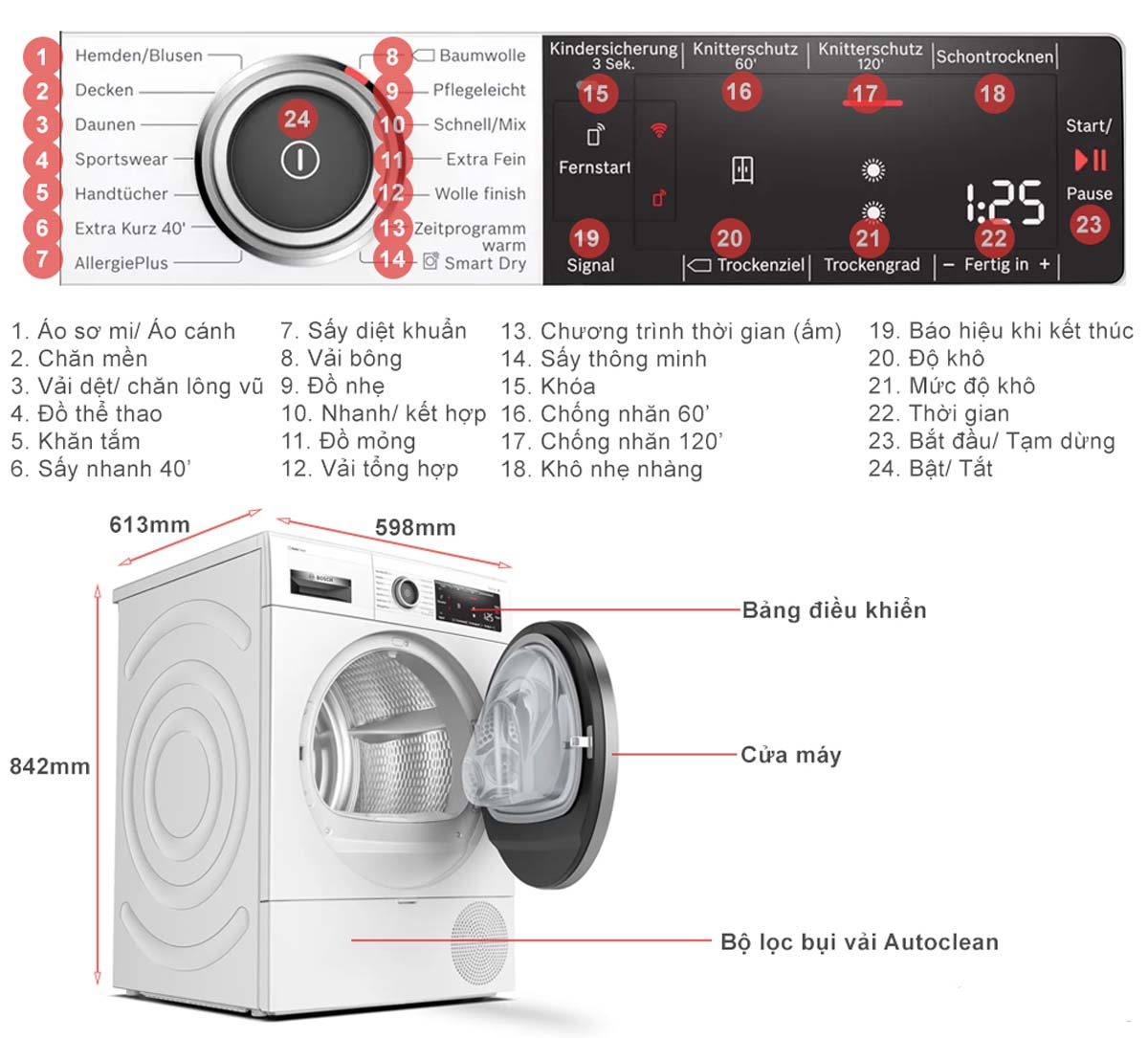 - AutoDry: Cảm biến độ ẩm giúp sấy khô chính xác và bảo vệ sợi vải
