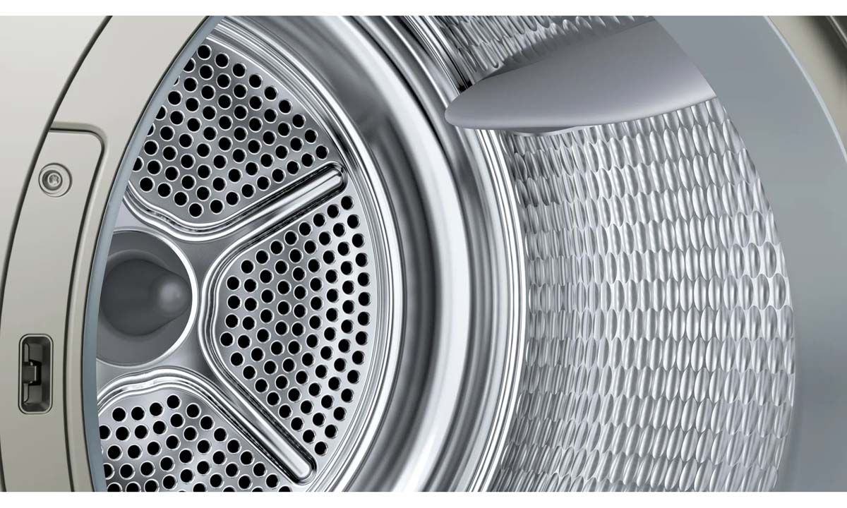 Lồng sấy SensitiveDrying của BOSCH WQB246CX0 có thiết kế bề mặt tổ ong mềm mại giúp khí nóng phân bố đều, làm khô quần áo nhẹ nhàng và chống nhăn. Cơ chế sấy quay đảo chiều liên tục giúp sợi vải không bị vón cục hoặc chà xát quá mạnh. BOSCH WQB246CX0 vì thế giữ cho quần áo luôn mềm mại như mới.