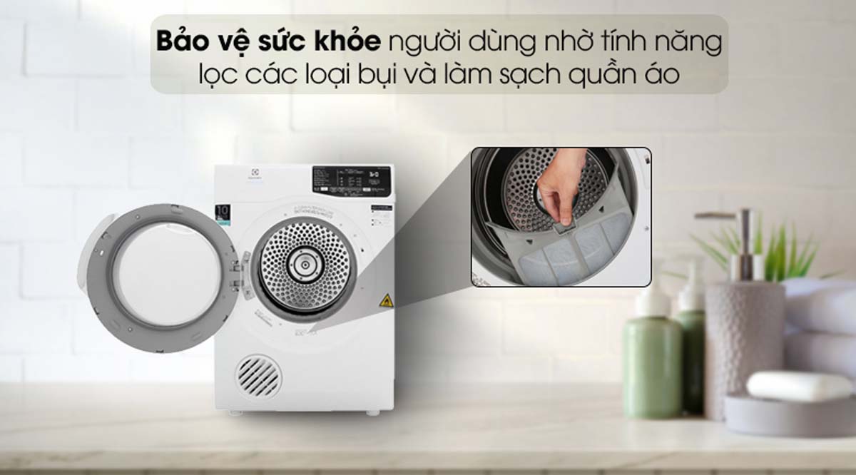 Máy sấy EDV705HQWA được trang bị bộ lọc bụi dễ dàng tháo lắp và vệ sinh, giúp loại bỏ xơ vải và bụi bẩn tích tụ sau mỗi lần sấy. Việc vệ sinh bộ lọc thường xuyên không chỉ giữ cho máy hoạt động hiệu quả mà còn kéo dài tuổi thọ của máy. Ngoài ra, máy sấy EDV705HQWA còn có đèn báo nhắc nhở khi cần vệ sinh bộ lọc, giúp người dùng dễ dàng theo dõi và bảo trì.