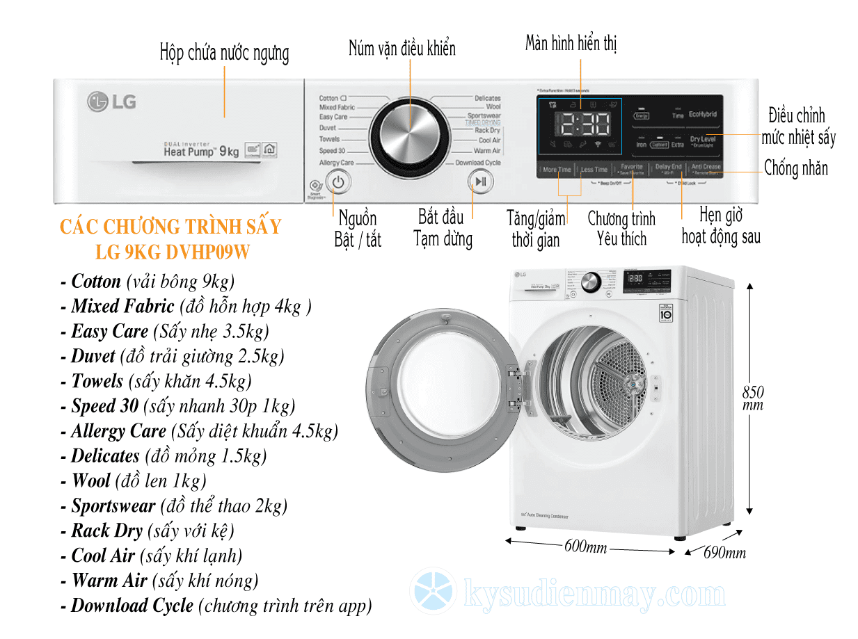 Thông số kĩ thuật Máy Sấy Quần Áo LG Inverter DVHP09W 9Kg