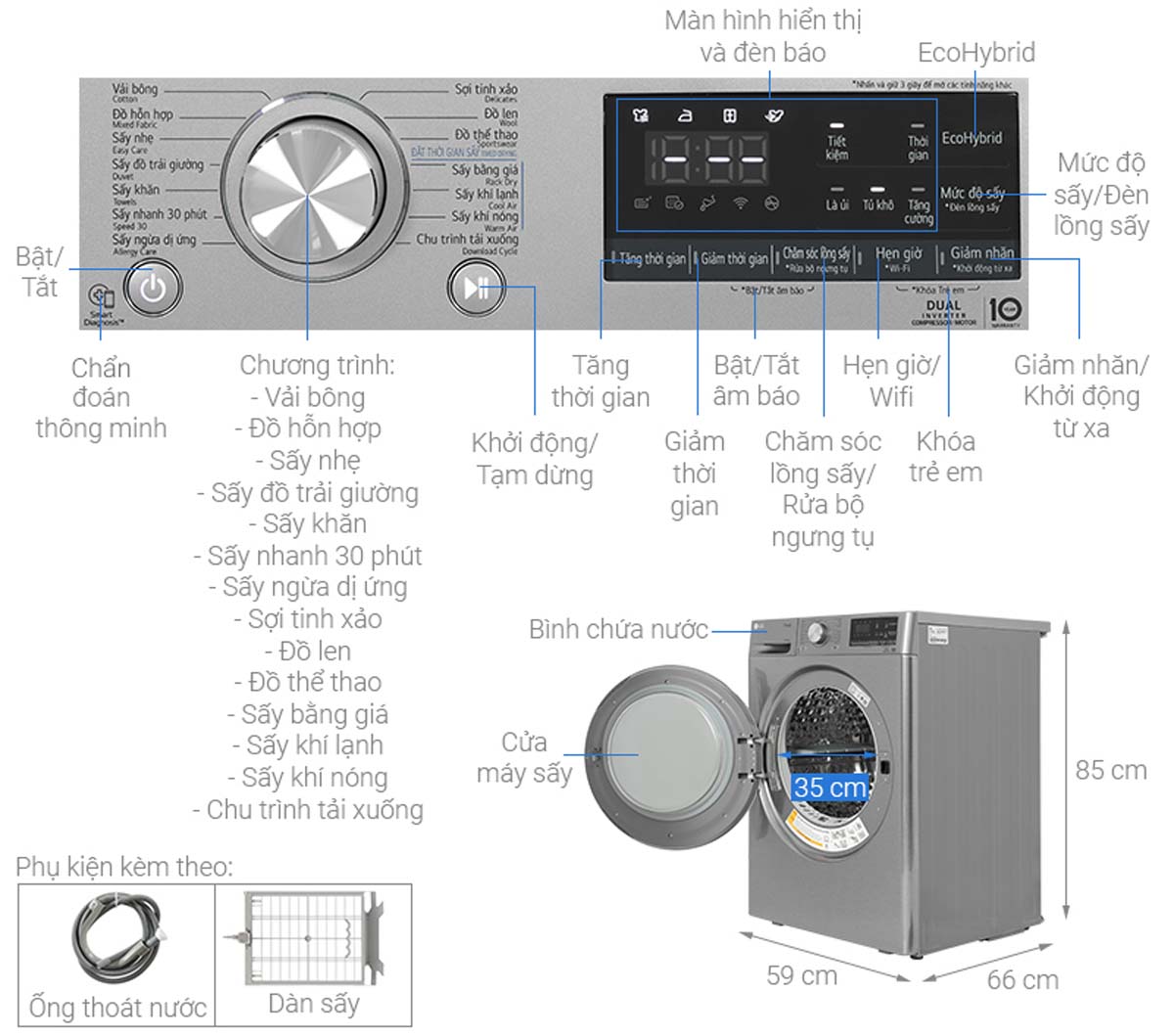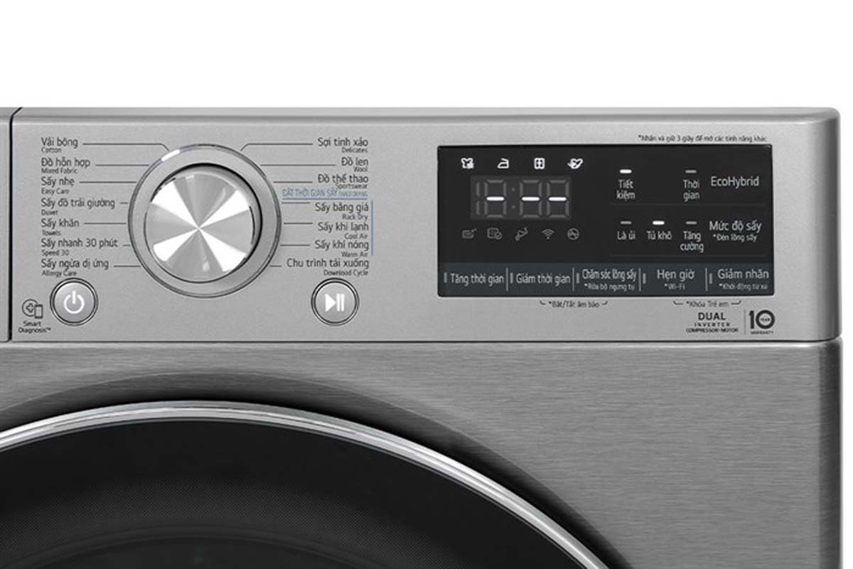 - Tiện ích: Khóa trẻ em, hẹn giờ sấy, sấy nhanh, đèn chiếu sáng lồng sấy, bảng điều khiển cảm ứng song ngữ, điều khiển từ xa qua ứng dụng LG ThinQ