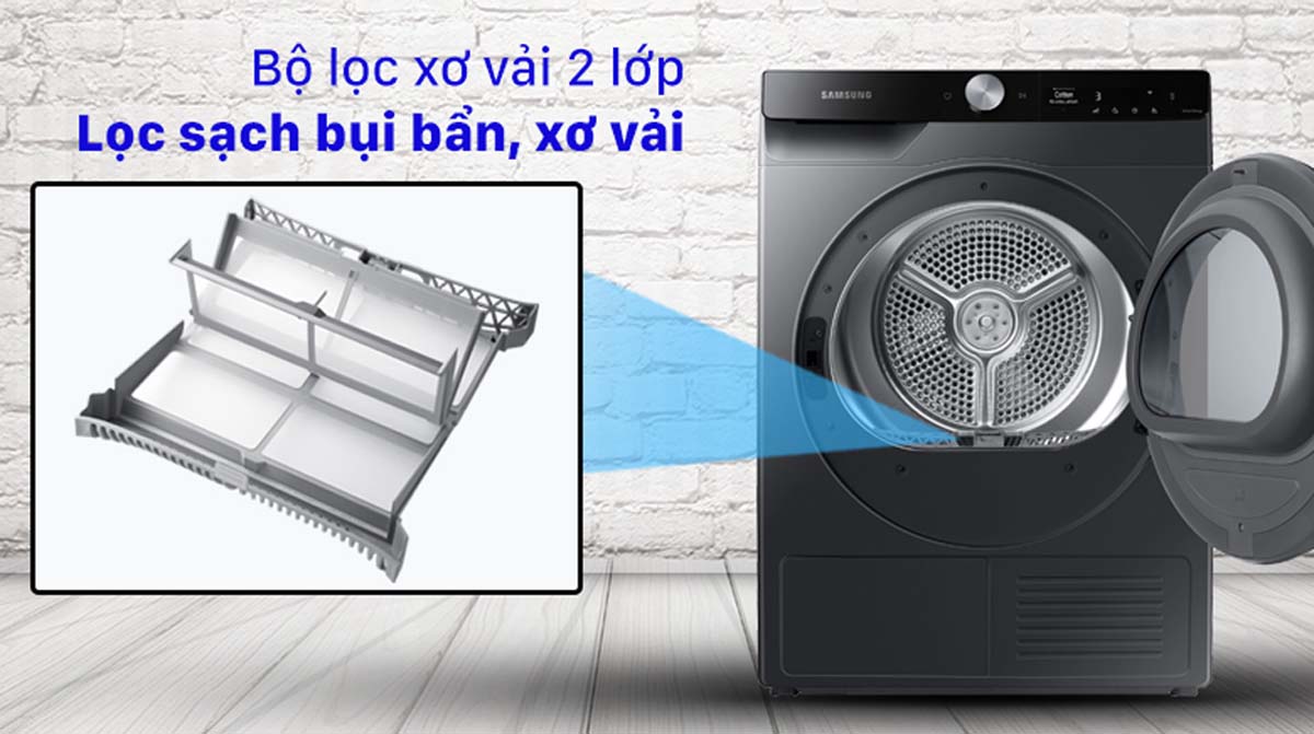 DV90T7240BB/SV được tích hợp bộ lọc kép chống bụi vải, dễ tháo lắp và làm sạch. Cảm biến tự động nhắc người dùng khi cần vệ sinh bộ lọc và bộ trao đổi nhiệt, giúp kéo dài tuổi thọ máy và duy trì hiệu suất sấy ổn định theo thời gian.