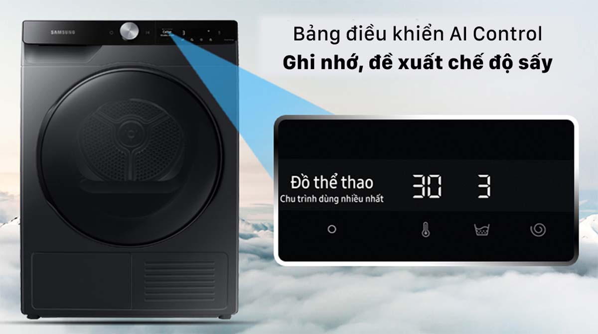 Máy sấy DV90T7240BB/SV trang bị AI Control có khả năng ghi nhớ thói quen người dùng và đề xuất chương trình sấy phù hợp. Giao diện điều khiển rõ ràng, dễ dùng, và có thể kết nối với máy giặt Samsung AI để đồng bộ hóa quy trình giặt sấy một cách thông minh và hiệu quả.