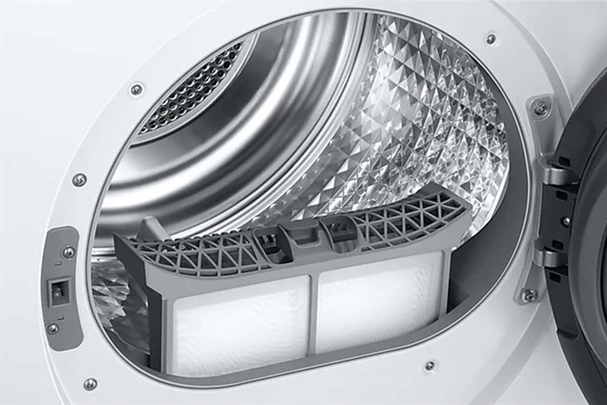 Máy sấy Samsung DV90T7240BH/SV sấy được trang bị bộ lọc xơ vải 2 lớp bằng thép không gỉ, giúp lọc sạch xơ vải và bụi bẩn sau mỗi lần sấy. Khi bộ lọc đầy, máy sẽ hiển thị đèn báo để người dùng biết thời điểm cần vệ sinh, đảm bảo hiệu suất sấy và kéo dài tuổi thọ máy.