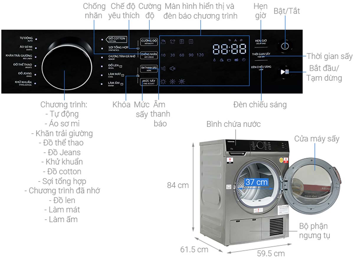 - Chương trình sấy: 12 chương trình – tự động, cotton, đồ len, áo sơ mi, thể thao, khử khuẩn, làm mát, làm ấm