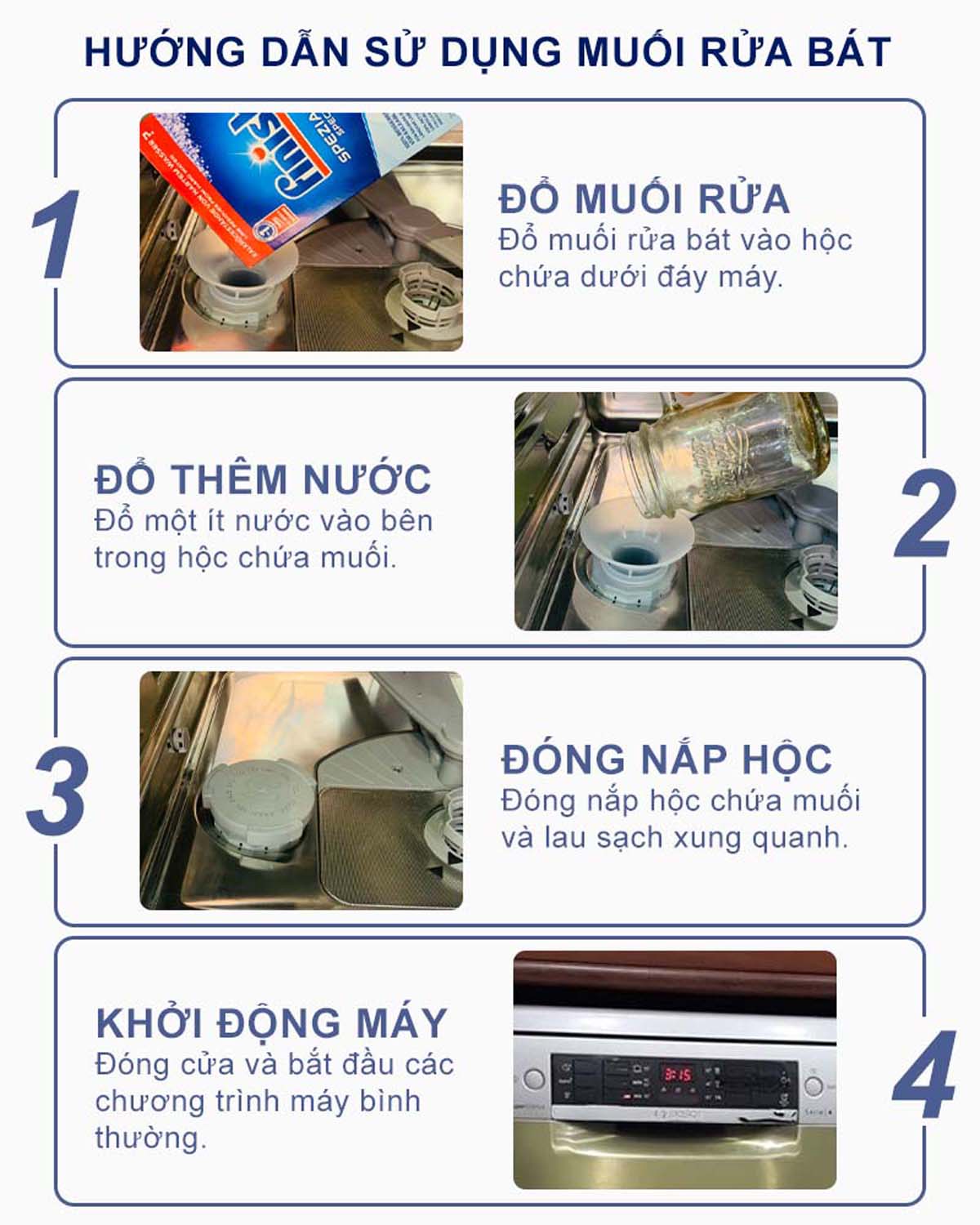 - Bước 3: Đóng chặt nắp ngăn đựng trước khi sử dụng. Thường xuyên kiểm tra và bổ sung muối thông qua đèn báo tích hợp trên bảng điều khiển của máy rửa bát.