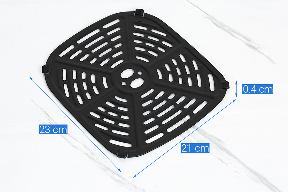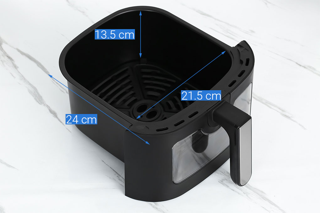 - Dung tích 7 lít rộng rãi cho phép bạn chiên nướng lượng lớn thực phẩm cùng lúc hoặc chế biến được gà nguyên con khoảng 1.5 kg.