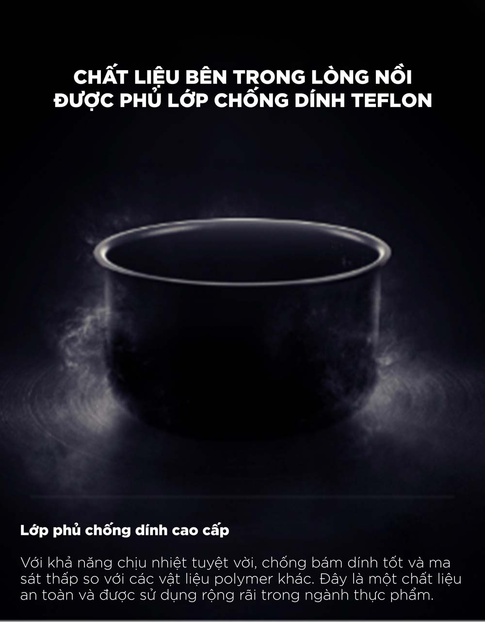 - Lòng nồi phủ men chống dính TEFLON cao cấp: Lòng nồi được phủ lớp chống dính TEFLON cao cấp, giúp cơm không bám dính và dễ dàng chất lượng, đồng thời mang lại khả năng chống dính cao cấp.