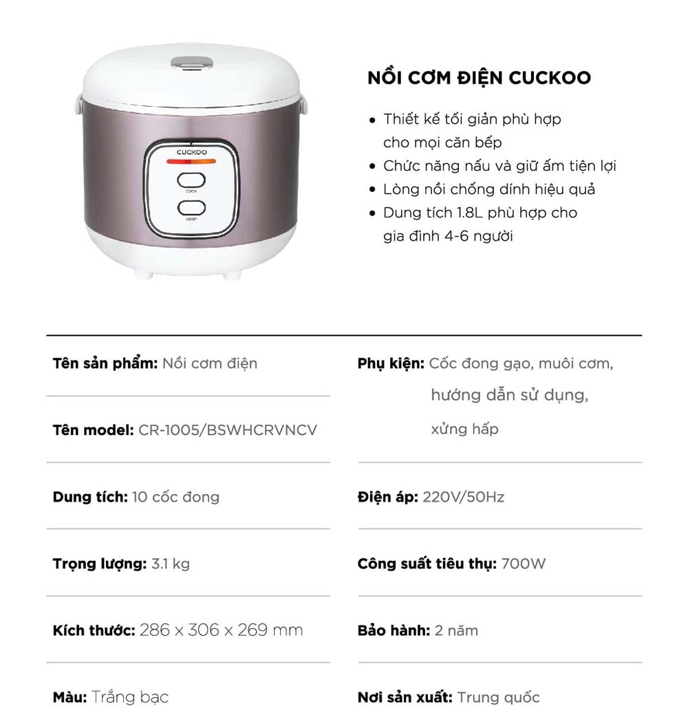Thông số kỹ thuật Nồi cơm điện cơ CUCKOO CR-1005 BSWHCRVNCV 1.8L