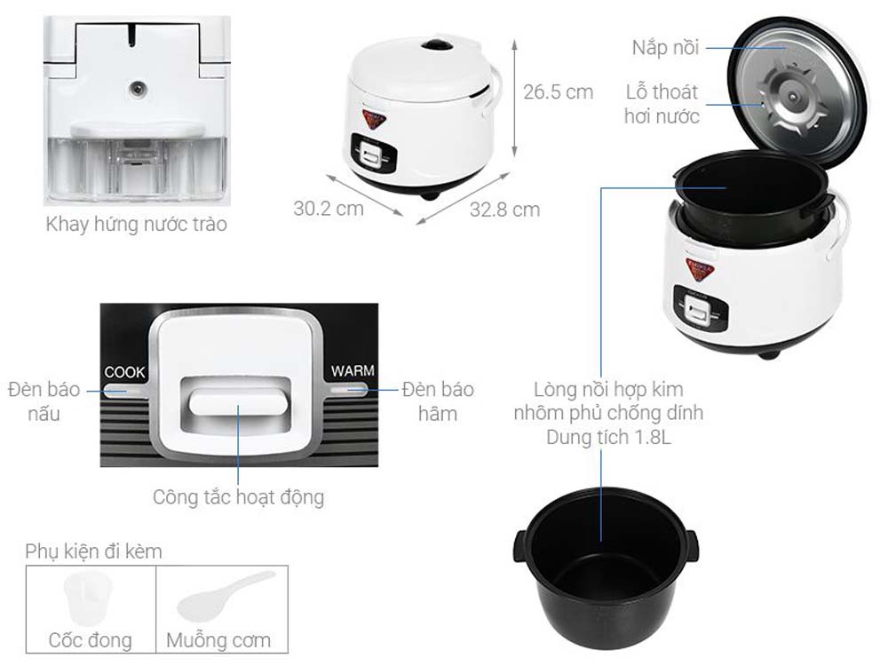 - Phụ kiện đi kèm: cốc đong gạo, muôi xới cơm, hướng dẫn sử dụng