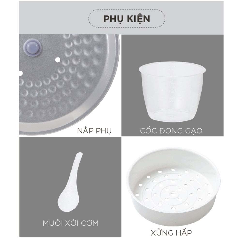 - Phụ kiện đi kèm: cốc đong gạo, muôi xới cơm, hướng dẫn sử dụng, xửng hấp