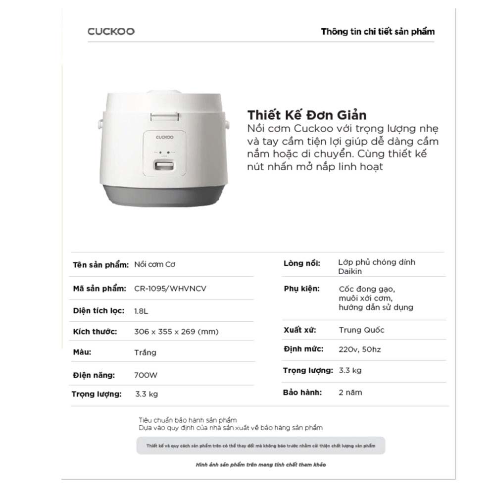 Thông số kỹ thuật Nồi cơm điện cơ CUCKOO CR-1095 WHVNCV 1.8L