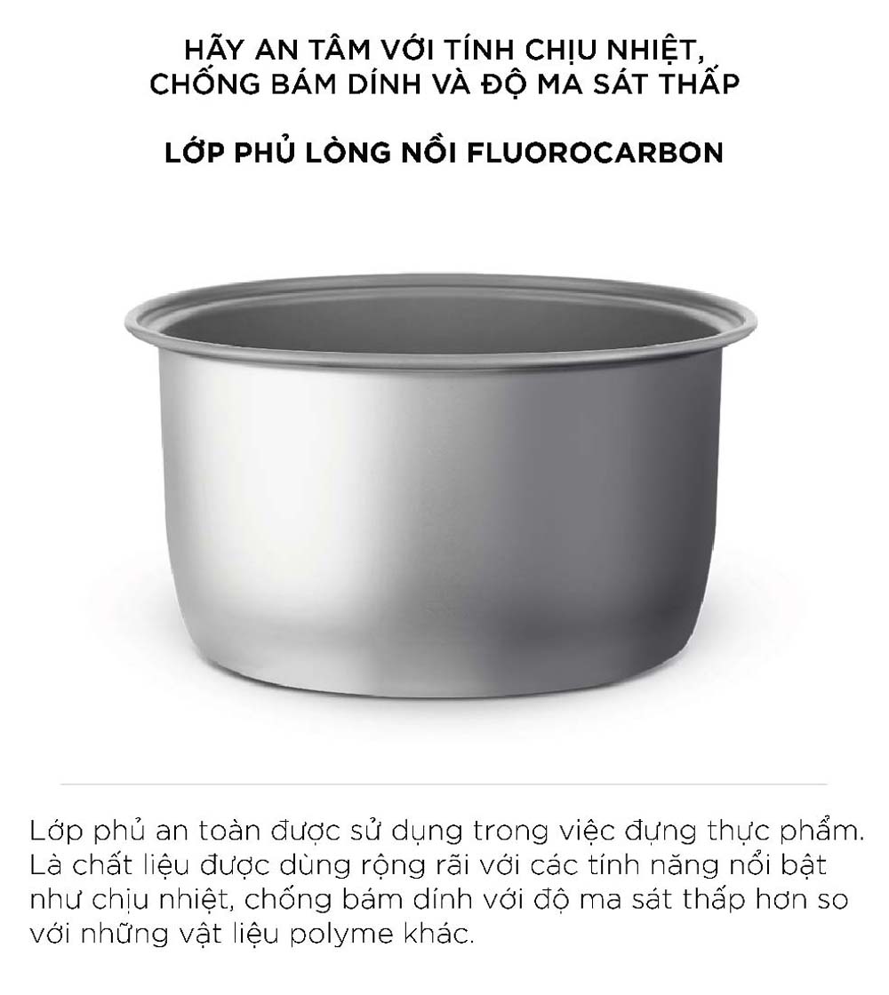 - Lòng nồi chống dính Fluorocarbon cao cấp: Lớp chống dính Fluorocarbon cao cấp giúp cơm không bám dính, dễ dàng chất lượng và đảm bảo hiệu suất nấu cơm.