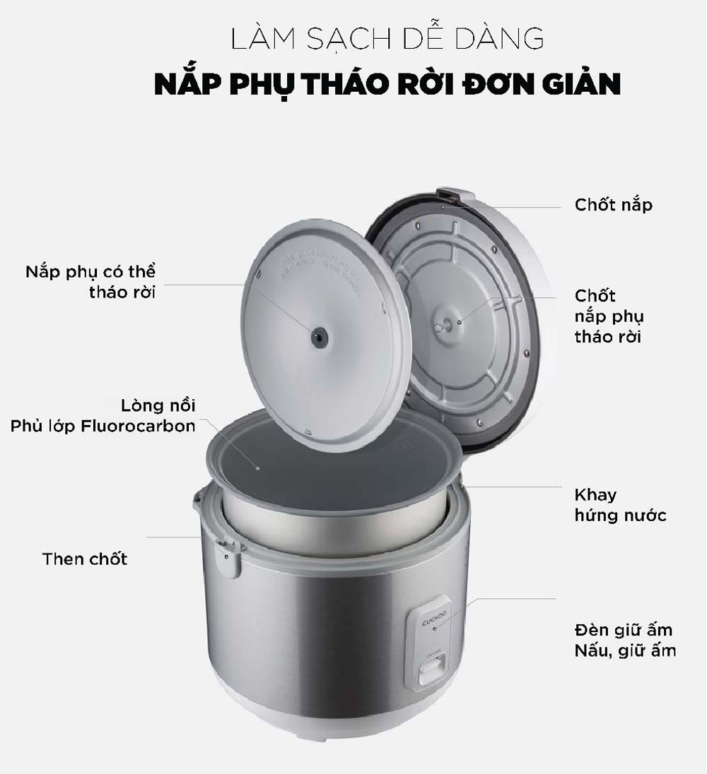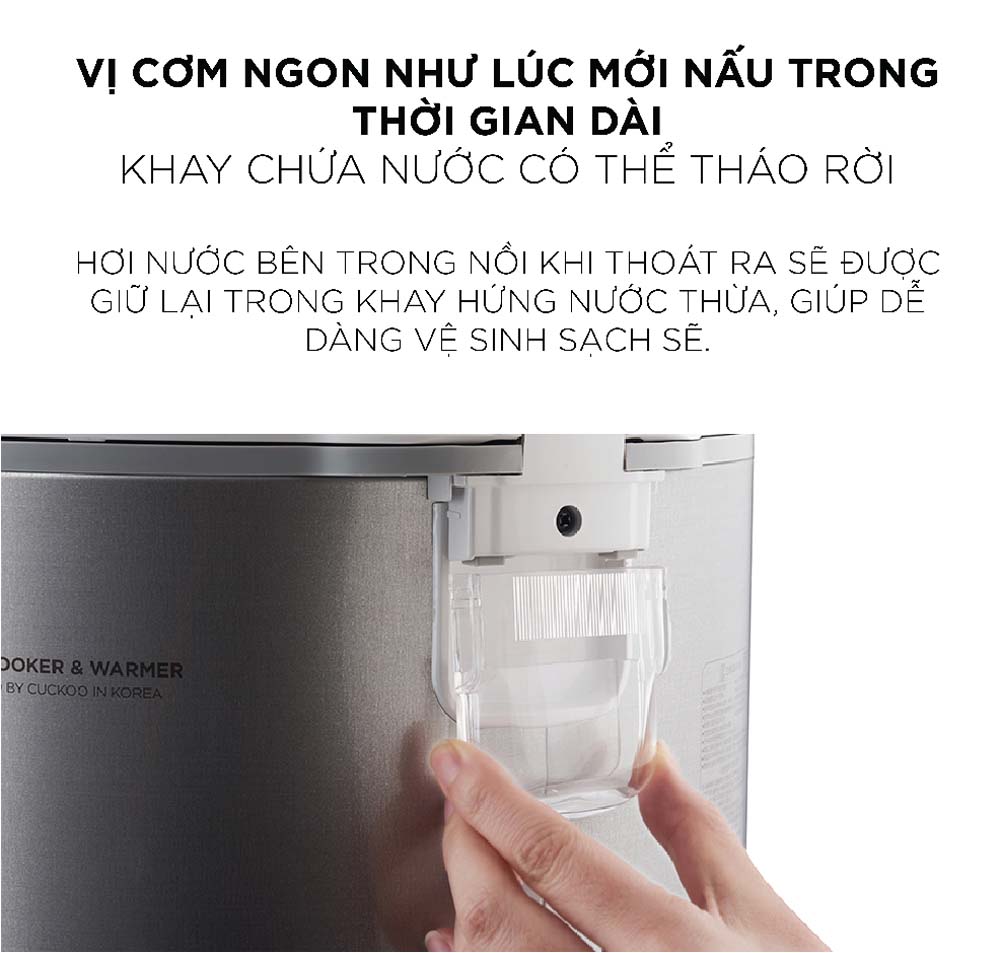 - Khay hứng nước thừa lớn: Khay này giúp làm sạch nước cơm đọng lại bên trong nồi khi nấu, giữ nguyên vị cơm ngon và tạo điều kiện thuận lợi cho quá trình bảo quản.