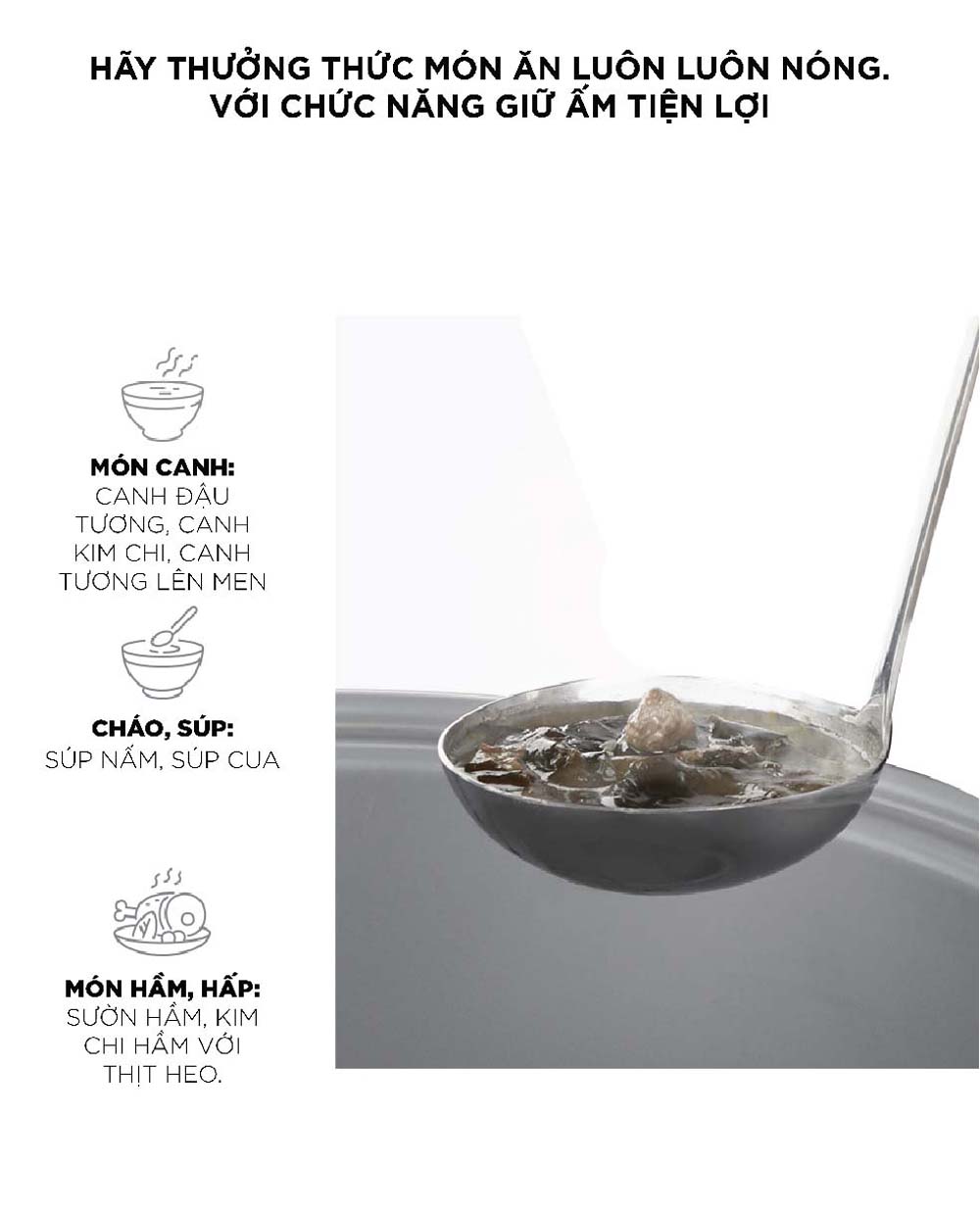 - Chức năng nấu cơm và ủ âm: Nồi cơm có chức năng nấu cơm và ủ âm, giúp đa dạng hóa việc chuẩn bị bữa ăn.