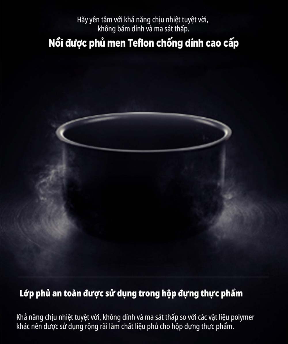 - Lòng trong của nồi được phủ lớp chống dính TEFLON, mang lại khả năng chịu nhiệt tốt, chống bám dính hiệu quả và giảm ma sát, đồng thời đảm bảo an toàn vệ sinh thực phẩm.