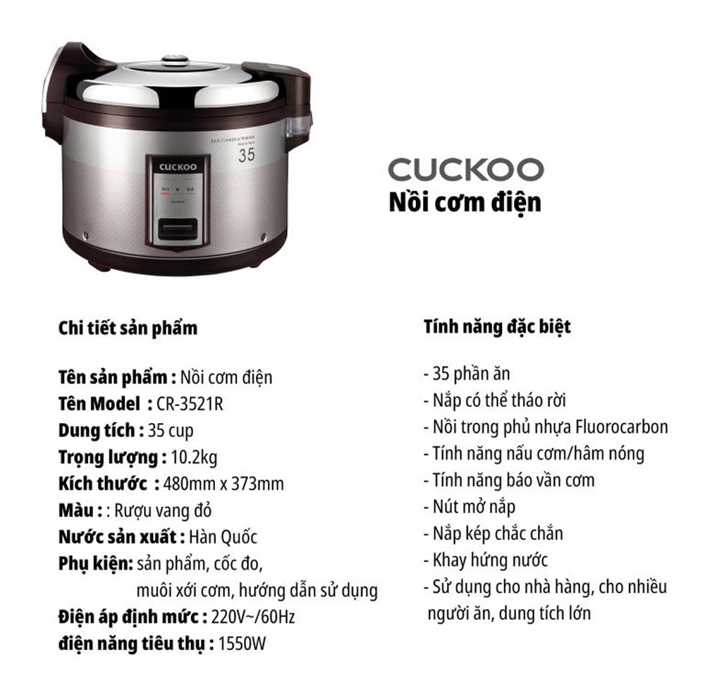 Thông số kỹ thuật Nồi cơm điện cơ CUCKOO CR-3521 RWVNCV 6.3L công nghiệp