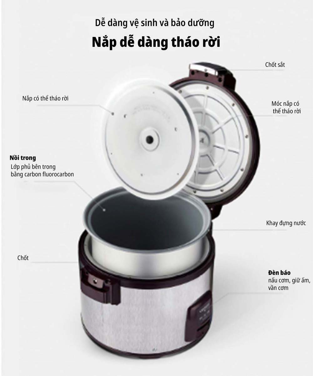 - Với dung tích lớn 6.3L, nồi cơm này có thể phục vụ đến 35 người, giải quyết mọi lo ngại về việc nấu và giữ ấm lượng cơm lớn.