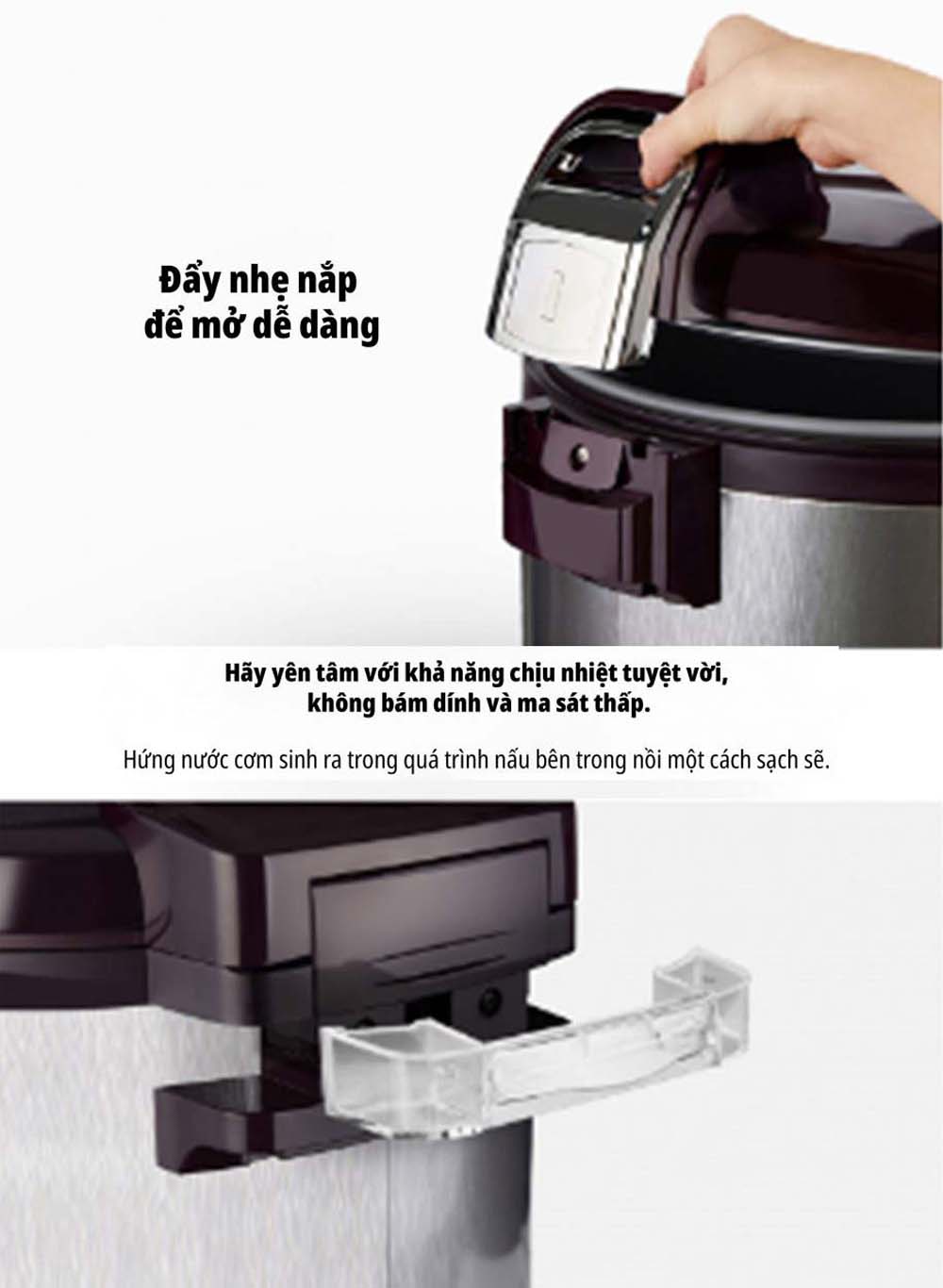 - Nút mở nắp nồi được thiết kế bền bỉ, dễ ấn nhẹ và mở nắp một cách thuận tiện.