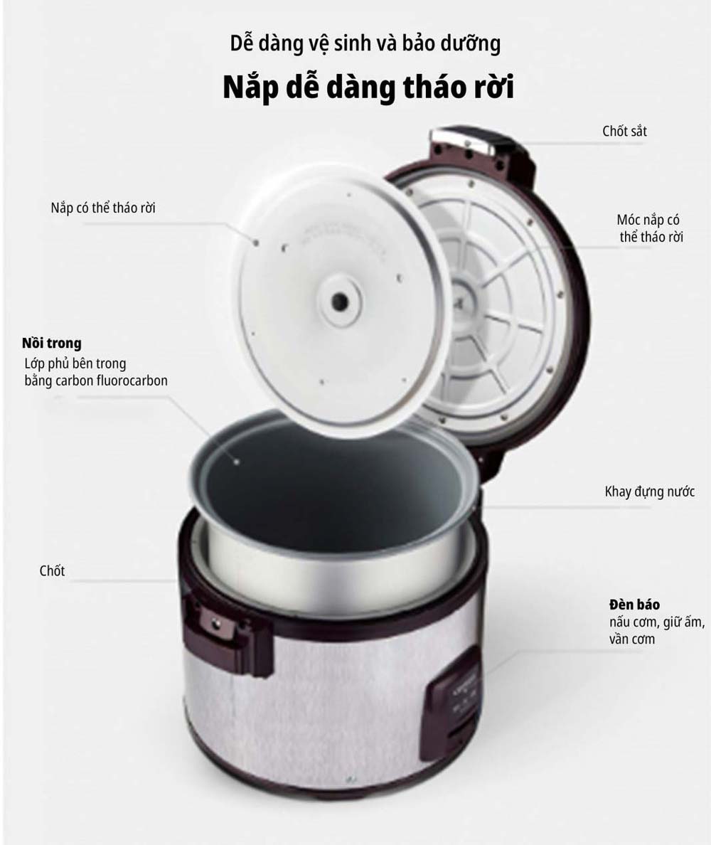 - Với dung tích lớn 6.3L, nồi cơm này có thể phục vụ đến 35 người, giải quyết mọi lo ngại về việc nấu và giữ ấm lượng cơm lớn.