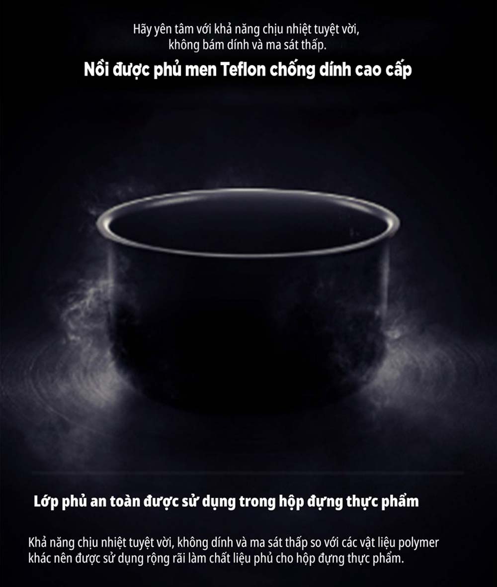 - Lòng trong của nồi được phủ lớp chống dính TEFLON, mang lại khả năng chịu nhiệt tốt, chống bám dính hiệu quả và giảm ma sát, đồng thời đảm bảo an toàn vệ sinh thực phẩm.