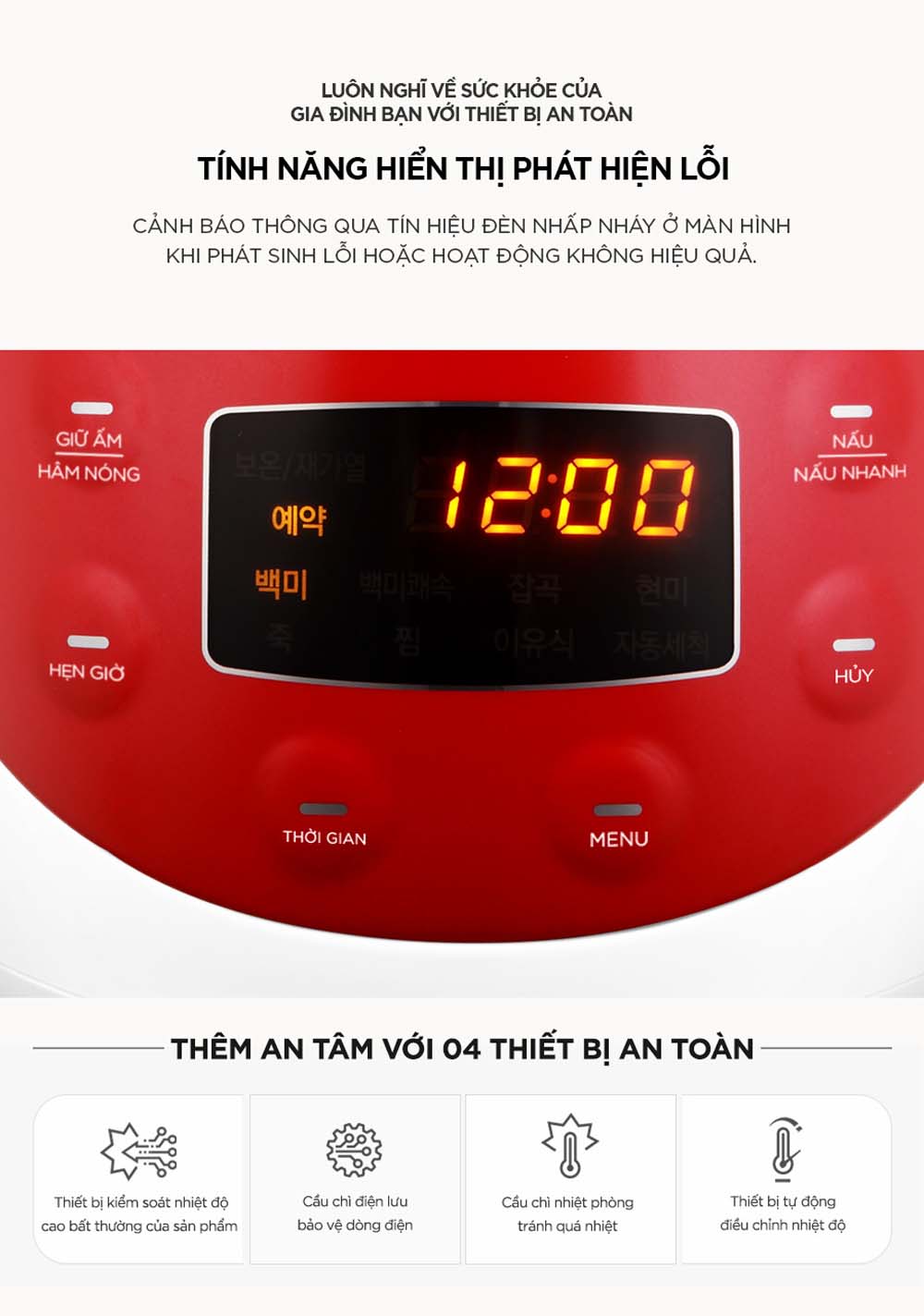 - Hiển thị phát hiện lỗi: Tính năng cảnh báo trên màn hình khi phát sinh lỗi, giúp người dùng dễ dàng theo dõi và xử lý tình trạng cơm hơn.
