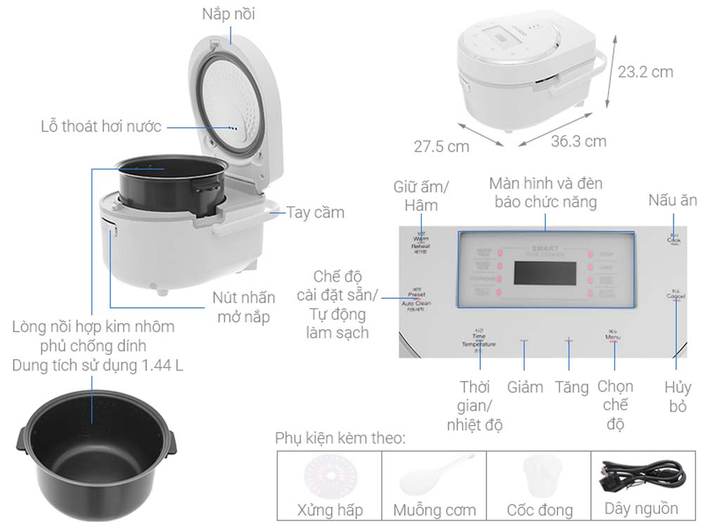 - Phụ kiện đi kèm: cốc đong gạo, muôi xới cơm, hướng dẫn sử dụng