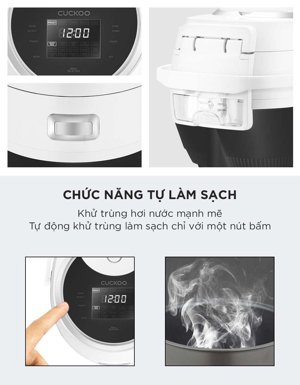 - Chức năng tự động làm sạch Auto Clean: Tính năng tự động làm sạch giúp bảo quản nồi cơm luôn sạch sẽ và tiện lợi.