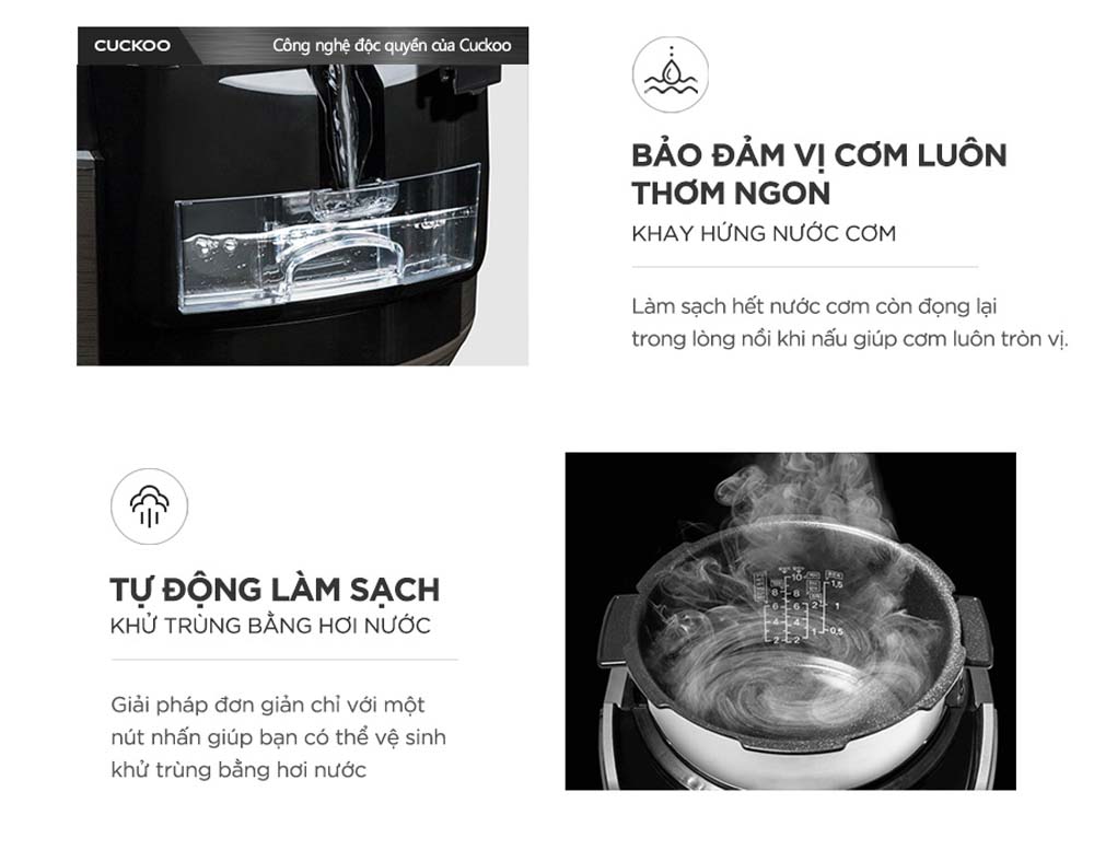 - Tự động làm sạch bằng hơi nước: Chức năng tự động làm sạch giúp bảo quản nồi sạch sẽ, tiện lợi cho quá trình bảo dưỡng và sử dụng hợp vệ sinh.