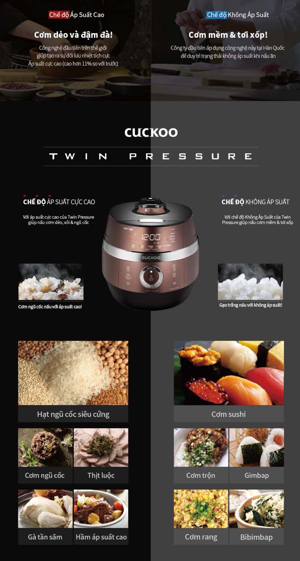 - Nồi cơm điện CRP-JHT1009F BRBKVN cao tần áp suất kép: 2 chế độ nấu áp suất cực cao tới không có áp suất.