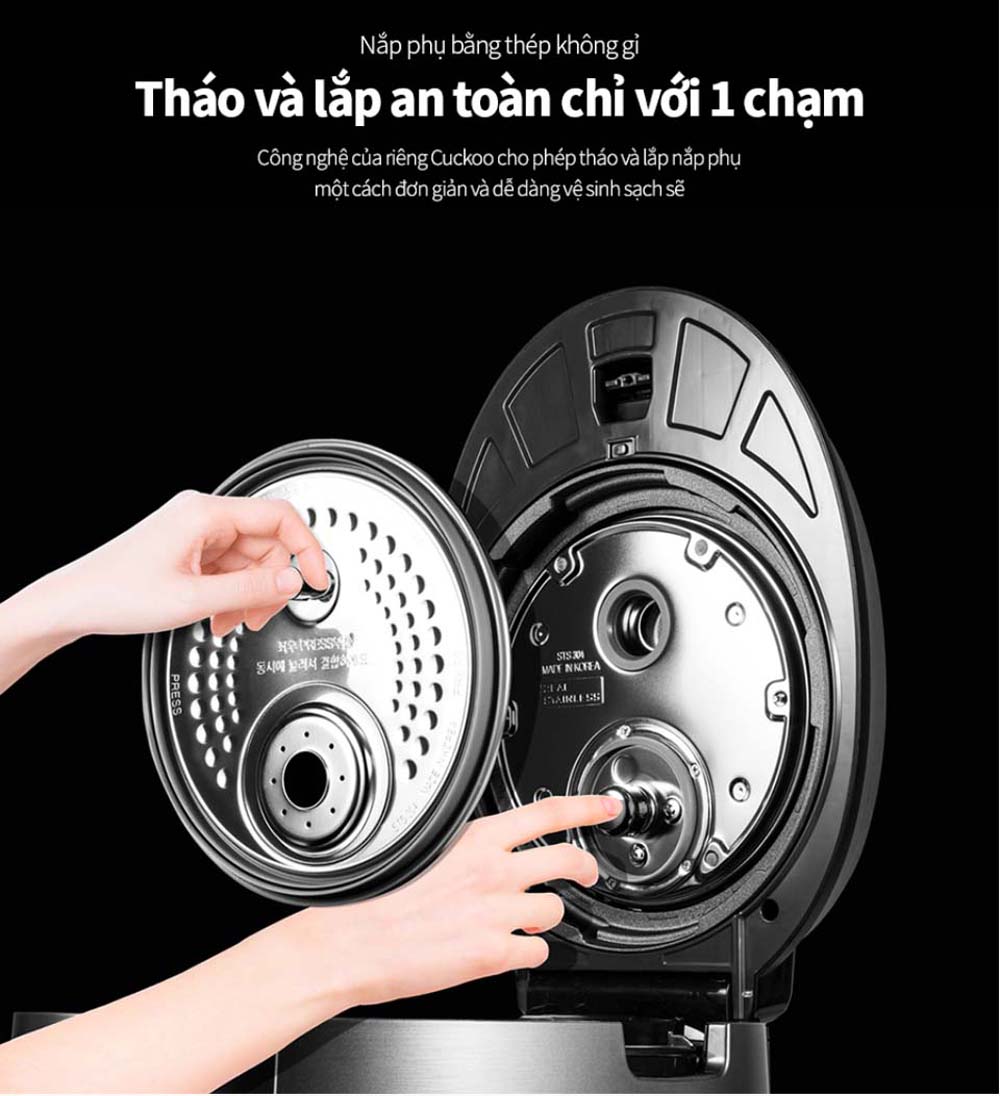 - Chất liệu thép không gỉ an toàn và bền bỉ, dễ vệ sinh: Nắp phụ bằng thép không gỉ và tháo lắp dễ dàng chỉ với 1 chạm.