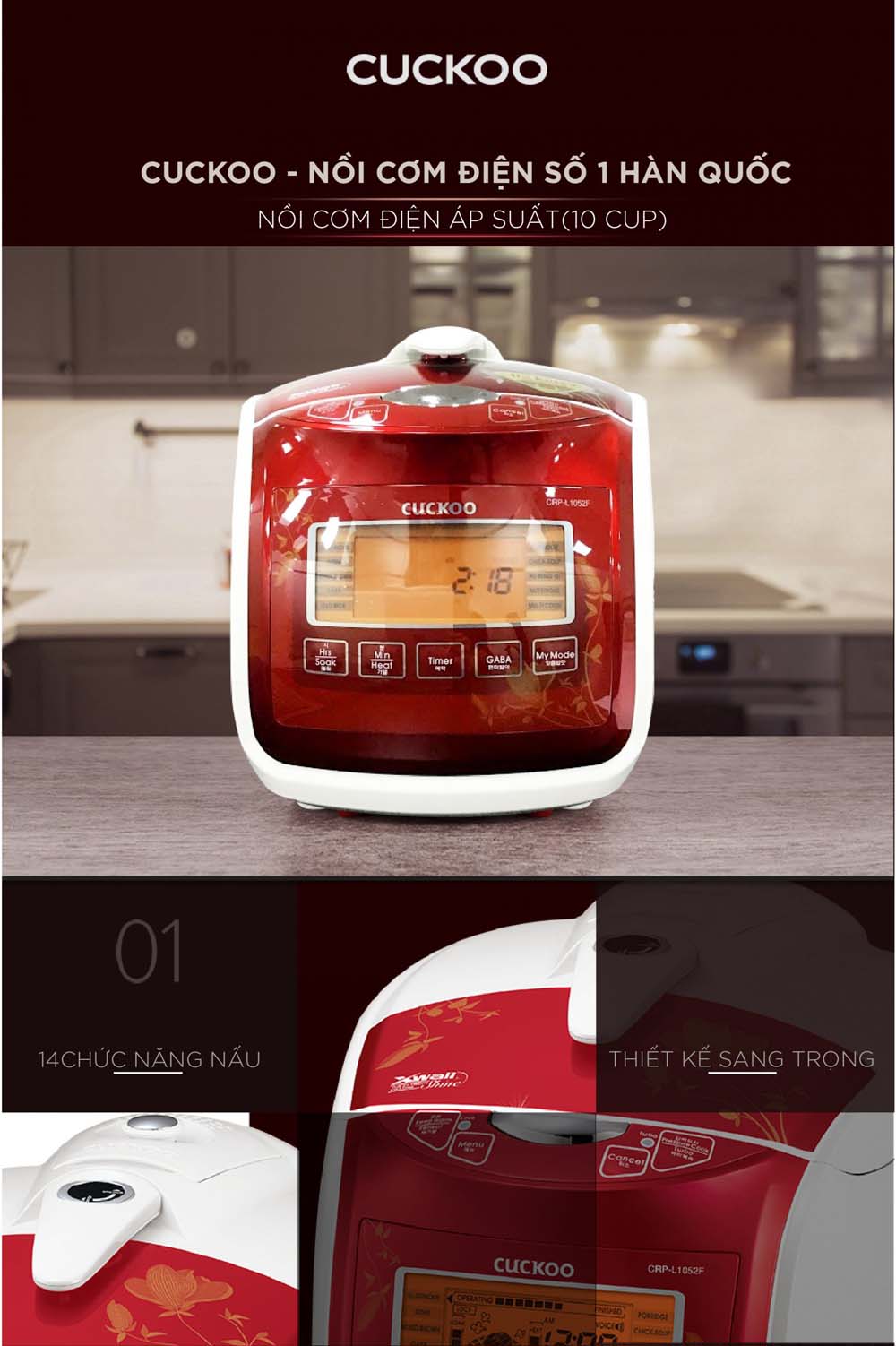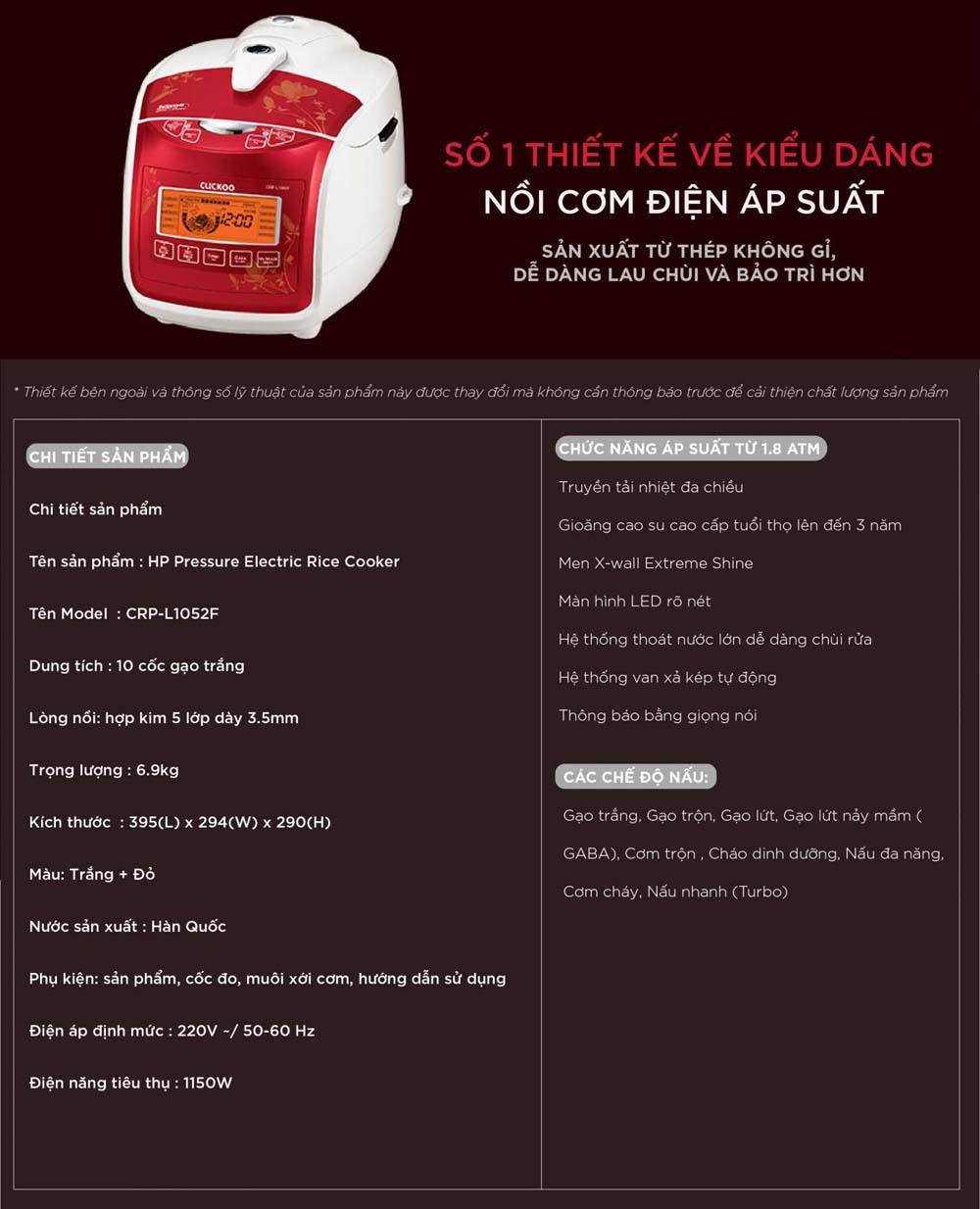 Thông số kỹ thuật Nồi cơm điện tử CUCKOO CRP-L1052F IVREVNCV 1.8L áp suất
