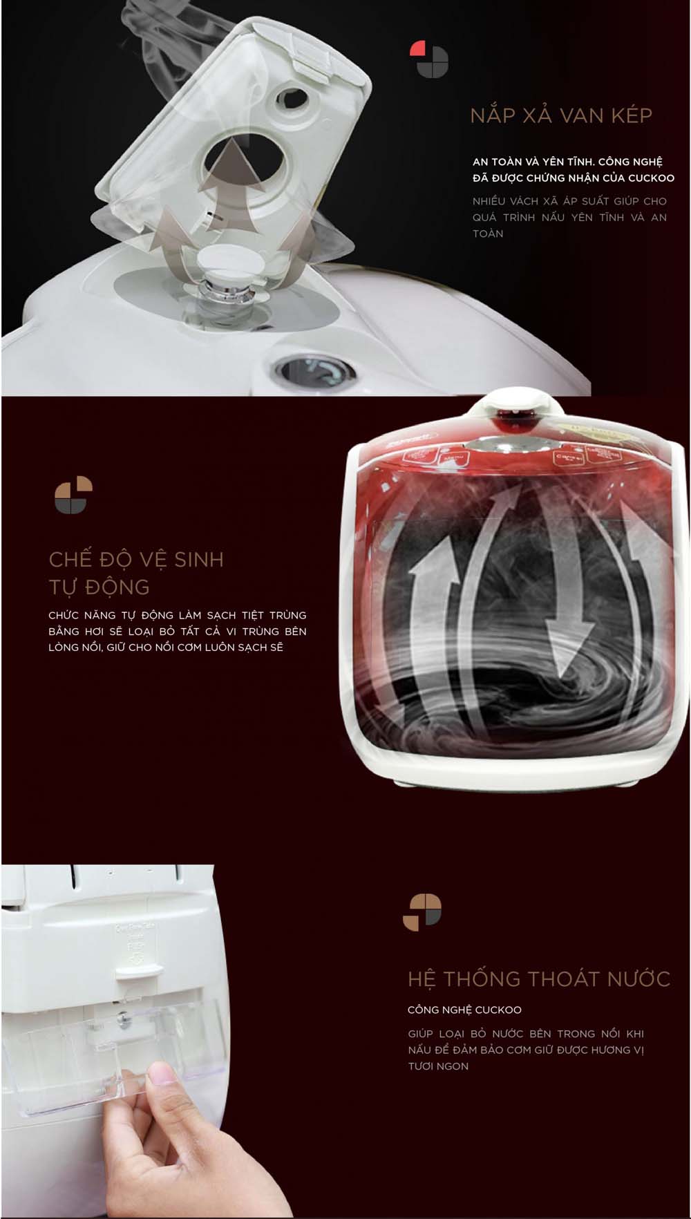 - Hệ thống van xả kép tự động: An toàn và yên tĩnh, giúp loại bỏ nước dư thừa một cách tự động.