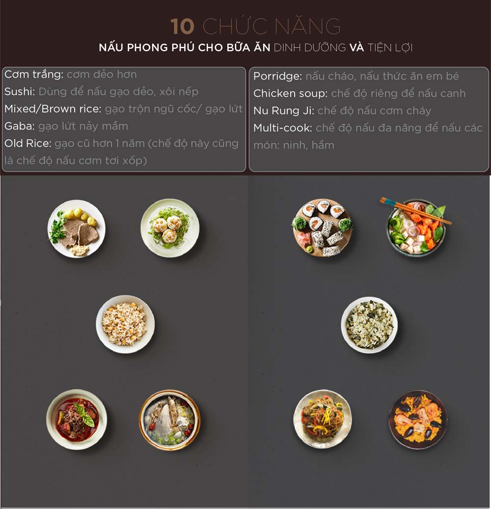 - Tính năng nấu gạo GABA: Tạo ra gạo GABA có lợi ích cho sức khỏe.