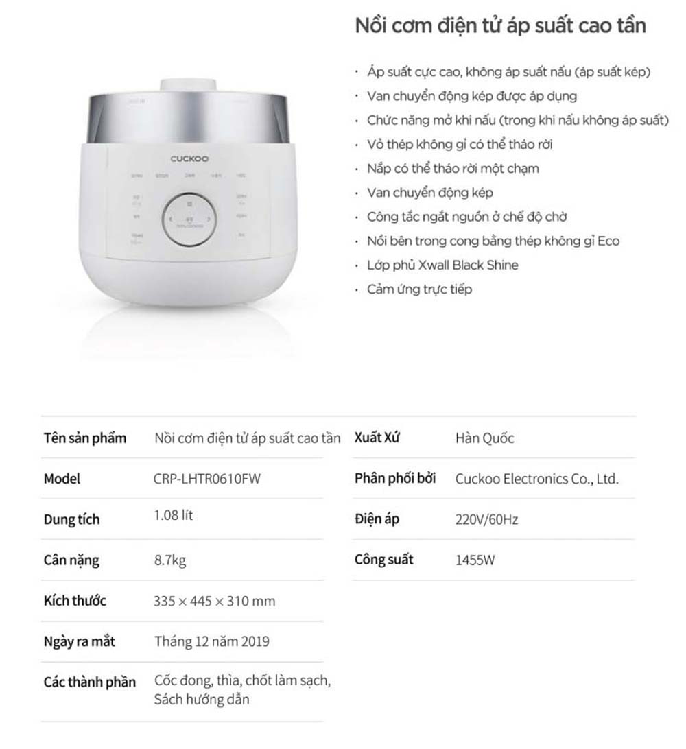 Thông số kỹ thuật Nồi cơm điện tử CUCKOO CRP-LHTR0610FW 1.08L áp suất kép cao tần