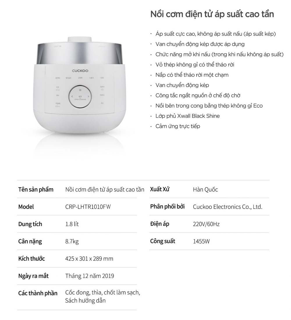 Thông số kỹ thuật Nồi cơm điện tử CUCKOO CRP-LHTR1010FW 1.8L áp suất kép cao tần